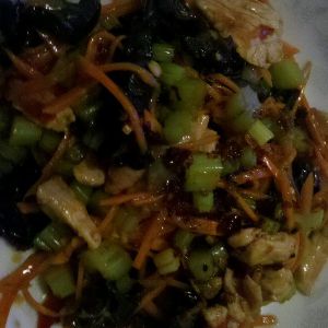 把芹菜,肉,木耳,加入生抽,盐,糖,醋,翻炒。加入一点水淀粉翻炒至汤汁浓郁