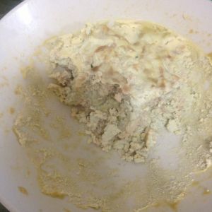 把肉末和臭豆腐拌好,在均匀加入鸡蛋液 和好,如图,在加入一点色拉油,撒盐和味精少许糖
