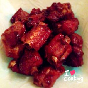 快收汁时,排骨撇到锅的一边,冰糖加入油中熔融,炒匀起锅,起锅时可用筷子只夹取排骨,避免太油腻