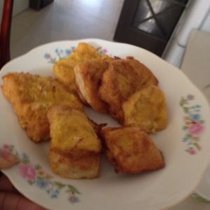 锅加热,加入少许油,用筷子夹着馒头片裹上蛋液