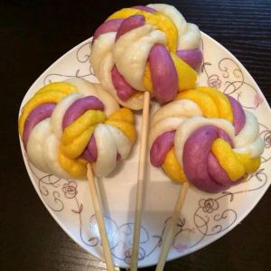 酵母放在水里化开,面粉加入少许盐和适量糖。面粉分成三份。一份和成白面,另外两份分别加入紫薯泥和南瓜泥,和成紫色面和黄色面两份。
