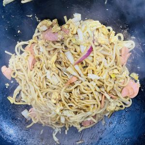 倒入面条,加入生抽,老抽少许,一勺盐,少量黑胡椒提味