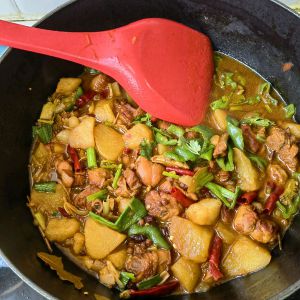 加入老抽,生抽,耗油,鸡精,白胡椒(一点点)调味,转小火满满炖煮,待土豆变软下入青椒,蒜苗,香菜,盐调味即可出锅