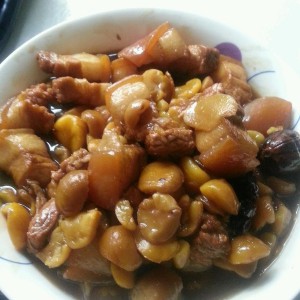 焖十分钟后加入板栗,转小火焖大概四十五分钟。这期间可以准备别的菜或者玩电脑去啦O(∩_∩)O~