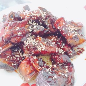 等待锅里水全部烧干后,起锅装盘。撒上芝麻。