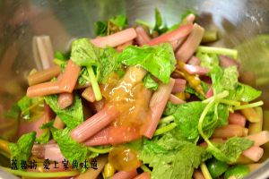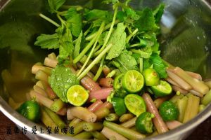 藕带控干水分,加入泡椒,小酸柑,薄荷叶,蜂蜜、白醋和少量盐,混合均匀,放入冰箱腌制1小时
