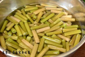 藕带切成5cm的段,热水下锅,焯水到变软,捞出放入冷水