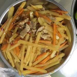 把蒜蓉猪肉爆炒后放入辣椒,醋然后把土豆丝红萝卜丝一起放入锅中爆炒30秒即可