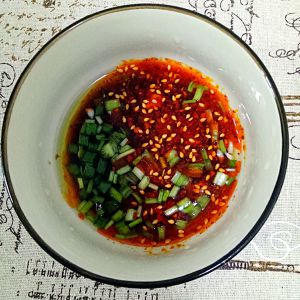 碗中放入盐,生抽,白醋,蒜末,葱花,辣椒油