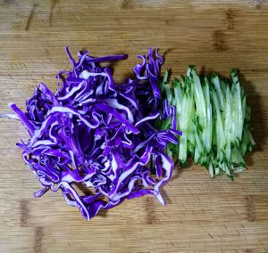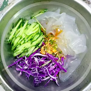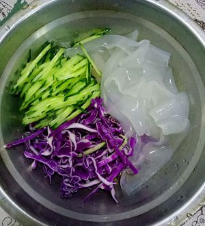 把紫甘蓝,黄瓜丝,拉皮放入一个大碗中