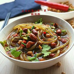 煮好的粉丝捞出放入辣椒面碗里,舀入煮粉丝的水和香醋,然后加入炒香的萝卜干、花生、黄豆和葱花、香菜即可!