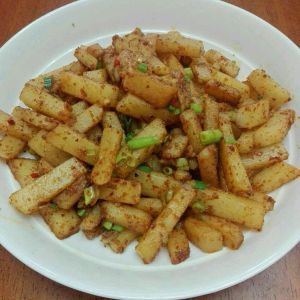 炒锅热油倒进煮好的土豆条,放入一勺海鲜酱,孜然粉一勺,辣椒粉一勺,盐半勺,在倒入切好的小葱,翻炒两下关火,放点鸡精翻炒均匀就OK了。