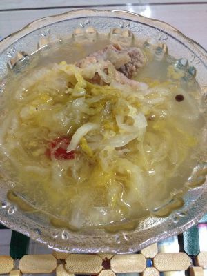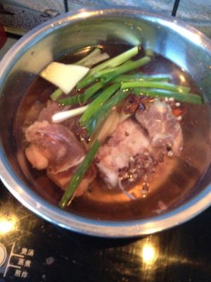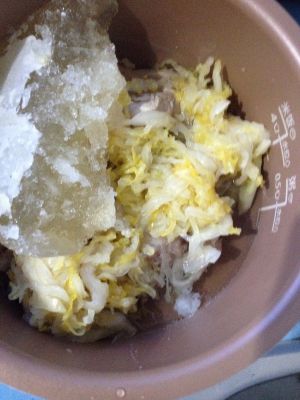 我用的是电饭锅的炖汤功能,高汤是上回做的冻起来了,放一点水再加一半的高汤冰块,加辣椒段、姜、葱花一起炖
