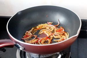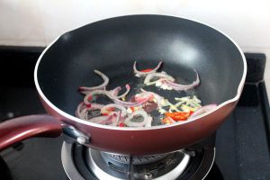 坐锅烧热放油,小火炒香大蒜,姜,洋葱。小米椒出香味。
