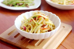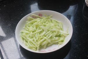 黄瓜丝腌制15分钟后倒掉腌出的水分。