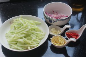 黄瓜切丝,用点盐抓均腌出水分,洋葱,大蒜,姜,小米椒全部切好待用。