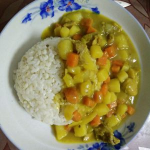 待咖喱全部融化后小火慢慢收汤至糊状。最后把做好的咖喱鸡块浇到饭上,咖喱鸡饭就做好啦!