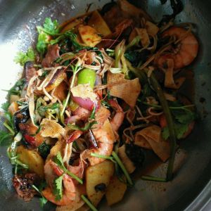 2.烧热油锅(稍微多写),把培根肉,土豆,大虾用油炸8分熟盛出待用