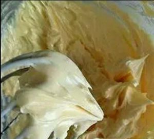 3. 淡奶油多次少量的加入到黄油中,每一次加入后完全打发后再次加入~避免水油分离