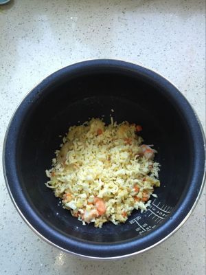 将炒好的饭转至在电饭煲里,在表面洒上芝士。再入电饭煲选择蛋糕模式烹饪半小时即可。