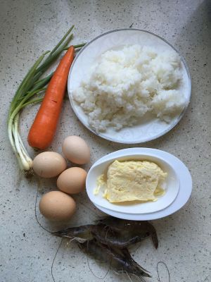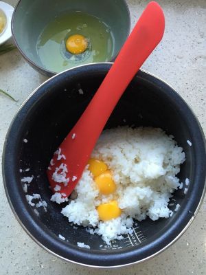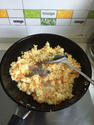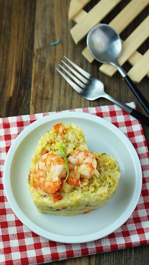 再将蛋黄液饭下炒炒至松散,并将虾仁一并加入同炒至熟。