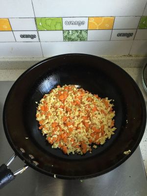 锅里加少许油,分别炒好蛋花及胡萝卜备用,炒制的时候加适量细盐调味。