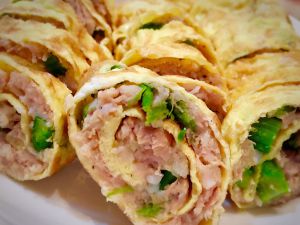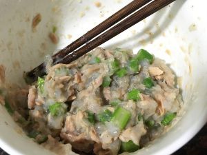 虾仁去除虾肠等剁碎,芦笋切粒,吞拿鱼罐头适量,根据个人口味添加麻油、盐、黑胡椒,搅拌均匀,待用。