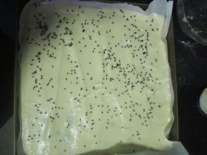 把面糊倒入烤盘,撒芝麻,不撒也没事。重重震几下使面糊分布均匀