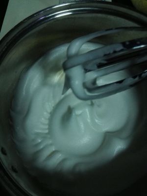 蛋清分三次加糖用打蛋器打至湿性起弯勾。做蛋糕卷蛋清不需要打的很硬。