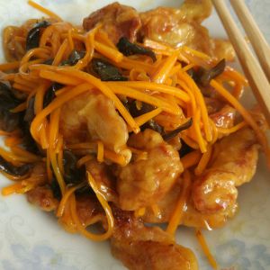 锅中留底油,放蒜末煸香,放胡萝卜木耳炒制,然后放入糖醋汁,待汁粘稠冒均匀小泡,就把炸好的肉片放入锅内,让肉片均匀裹上糖醋汁就可以出锅了!