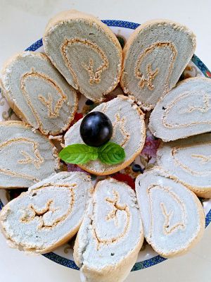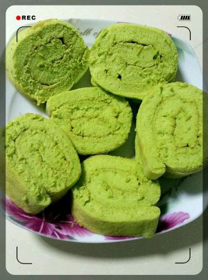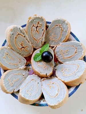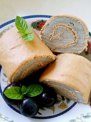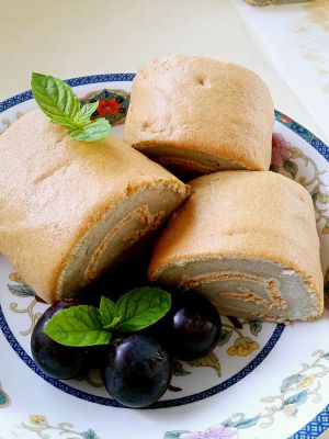 成品图(烤好的蛋糕趁热拿出来脱离油纸,反过来趁热卷好油纸压着定型)