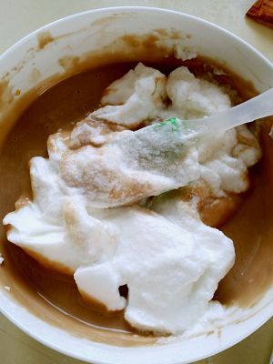 拨点打发好的蛋清和面糊切拌匀,接着把拌好的面糊全部倒入蛋清中一起翻拌。