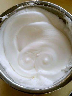 接下来打发蛋清,滴几滴柠檬汁袪腥味,白砂糖分三次依次加入蛋清中打发。