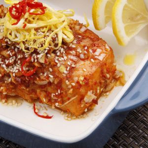 将腌好的三文鱼放入烤盘中,放入200°的烤箱中,烤10分钟,取出后放入蛋皮、均匀撒入白芝麻即可。