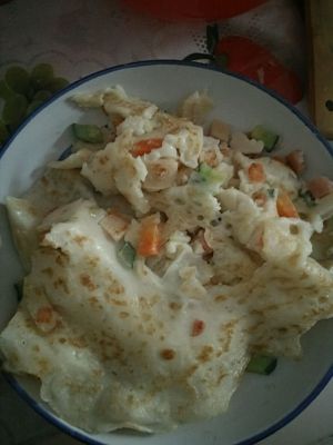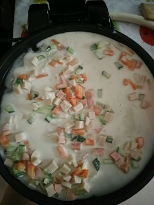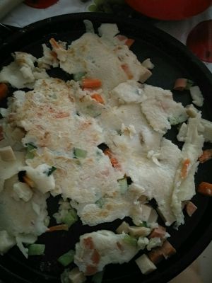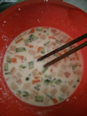 把面粉加水 成糊糊状 把备好的材料放进去 加点葱和盐