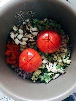 然后准备好洗好的米 放上水 把菜菜们摆入锅中~ 可以在放菜前滴几滴油 盐 黑胡椒 (也可以放菜后再搁)