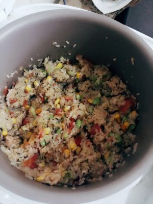 然后就可以蒸啦 等哦等哦~出锅咯 就是介样 米饭有些干 不要怕 把三个西红柿杵碎 拌拌拌~ 其实可以放点芝士 家里没有 就没放 放芝士的话 就放好闷一会儿 再搅拌