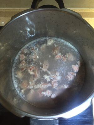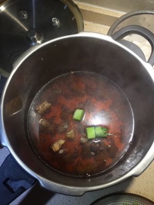 将喂好的牛肉连同喂料一并放入高压锅中,加葱段,添适量热水,注意,一定要添加热水!如果怕淡,可以再添加少量盐。