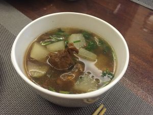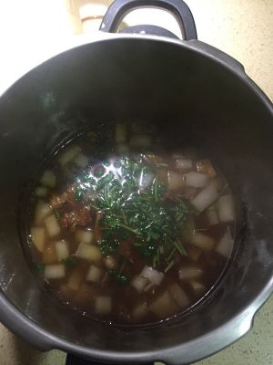 在压好的牛肉汤中直接下入白萝卜块儿炖煮,注意不要盖锅盖,大概煮十几分钟致萝卜块熟了下入香菜沫。出锅前可以视个人口味调味。