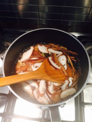 香菇放水里稍煮,再一次放入黄花菜木耳龙利鱼