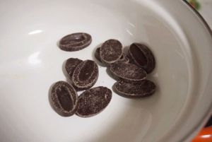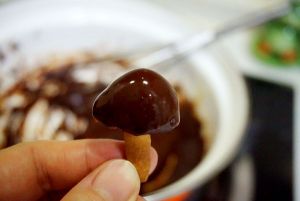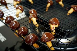 防止巧克力太干,加热的过程中逐步加入牛奶,搅拌到顺滑即可。取一个蘑菇饼干,用蘑菇头沾一下巧克力液,晾干即可。