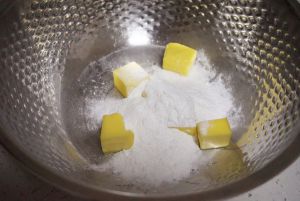 黄油软化,按照需要分量放入容器碗中。加入糖粉,用刮刀搅拌均匀。