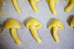 将面团分为3克一个,全部分好之后,再一分为二,一份揉成蘑菇柄,一份揉成蘑菇伞状,再组装起来。依次都做好。这部不难,就是需要耐心,可以和孩子一起来制作,很好玩。