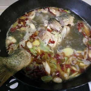 将葱姜蒜放入鱼肚中,里外放入适量的花椒大料盐酱油料酒醋