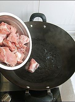 先把排骨放进开水里焯一下,去去血水,不能忘了,焯排骨的水里放料酒!!去腥味儿!