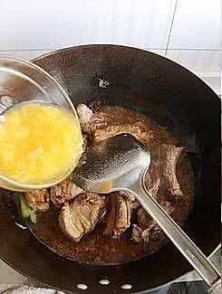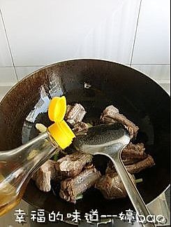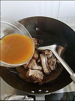 放入排骨翻炒,加少许料酒、酱油、陈醋。