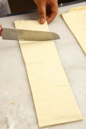 将丹麦面团擀压至0.5厘米厚,分割成11乘11厘米的正方形。