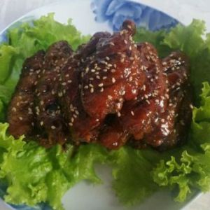 盘底用两片生菜垫底,把做好的鸡翅用筷子摆盘(把葱姜蒜一些调料去掉,影响美观)最后撒一些熟芝麻即可。