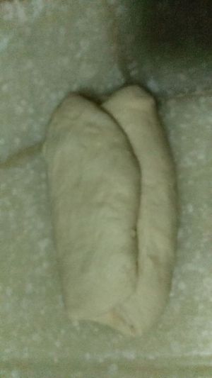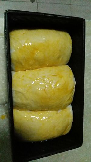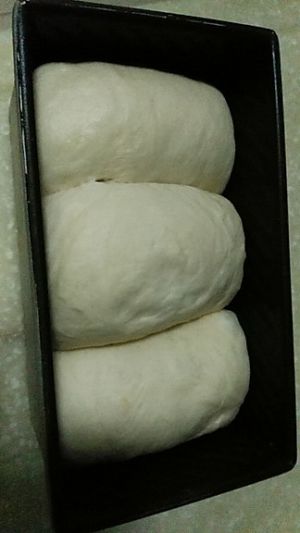 做好三个面卷,并排摆在土司盒中,盖湿布二次发酵。