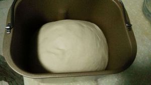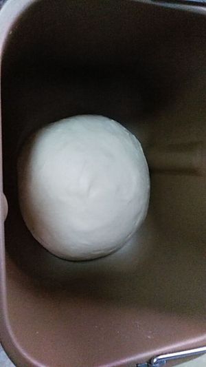 放入面包机,两个和面程序共40分钟,面团揉至完全扩展阶段。面团克轻松拉出手套膜。
